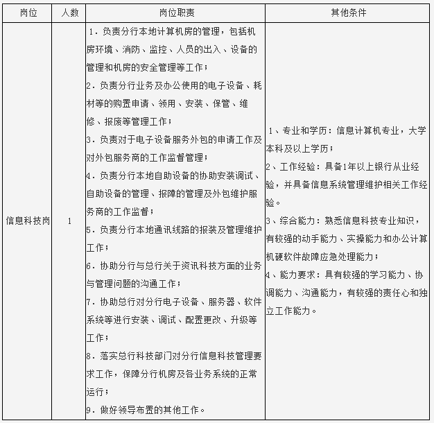 基本要求:大学本科及以上学历,且全日制为大专及以上学历,信息计算机专业;具备1年以上银行从业经验,并具备信息系统管理维护相关工作经验;有较强的敬业精神,无违规违纪等不良记录;具备良好的进取心、责任心。