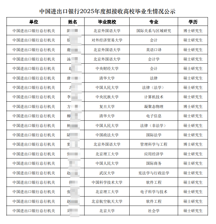 原标题:中国进出口银行2025年度拟接收高校毕业生情况公示