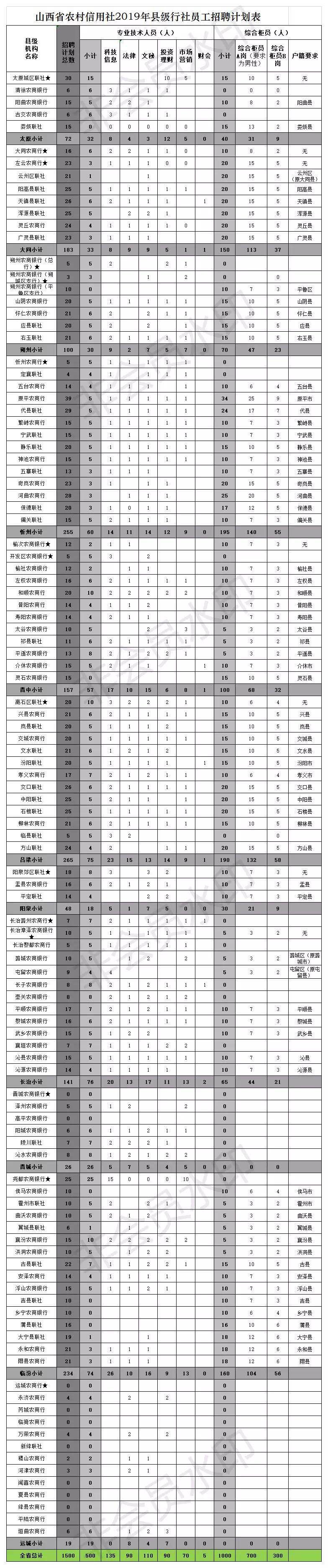 (二)根据各县级行社的招聘摸底需求,综合考虑各机构网点人员平均数量、劳务派遣制员工比例及专业技术人员等队伍建设现状,2019年度拟为基层行社招聘员工总数为1500名,其中:综合柜员A岗(兼职营业网点保卫、守押、值班和安全防火)700名,限男性;综合柜员B岗300名;专业技术人员500名。县级行社具体招聘岗位、人数及相关要求见附件《山西省农村信用社2019年县级行社员工招聘计划表》 。