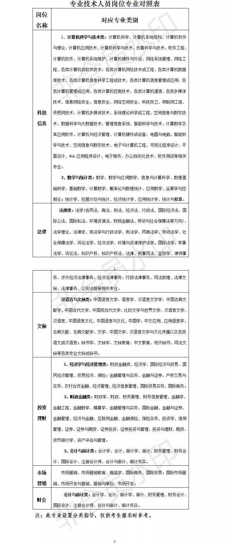 专业技术人员:(1)科技信息岗:须为计算机科学与技术类、数学与统计类相关专业;(2)法律岗:须为法律类相关专业;(3)文秘岗:须为汉语言与文秘类相关专业;(4)投资理财岗:须为经济学与经济管理类、财政金融类、会计与审计类相关专业;(5)市场营销岗:须为市场营销类相关专业;(6)财会岗:须为会计与审计类相关专业。